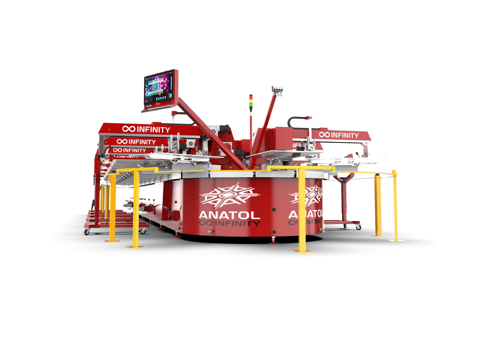 Anatol’s team of engineers, working in coordination with screen printing companies from around the world, set their decades of experience to work with the goal of designing the industry’s most capable and reliable oval screen printing machine. Incorporating many of the advances refined in our industry-leading fully-servo VOLT carousel press, we are proud to introduce INFINITY: the world’s first and only fully-servo oval automatic screen printing machine.